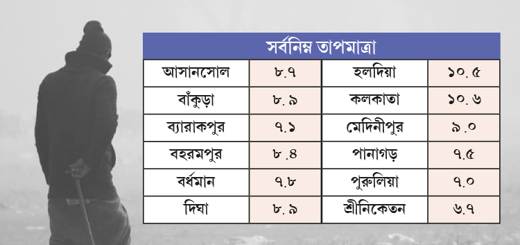 পুরুলিয়াতে এ দিন ৭ ডিগ্রিতে নেমে গিয়েছিল পারদ। বাঁকুড়ায় ৮.৯। বীরভূমের শ্রীনিকেতনে এ দিনের সর্বনিম্ন তাপমাত্রা ছিল ৬.৭, বর্ধমানে ৭.৮, দিঘায় ৮.৯, পানাগড়ে ৭.৫, কলাইকুণ্ডায় ৬.৩ ডিগ্রি সেলসিয়াস। দমদমে সর্বনিম্ন তাপমাত্রা ছিল ৮.৭। ব্যারাকপুরে ৭.১। ডায়মন্ডহারবারে ৯.৭ ডিগ্রি। বহরমপুরে ৮.৪।