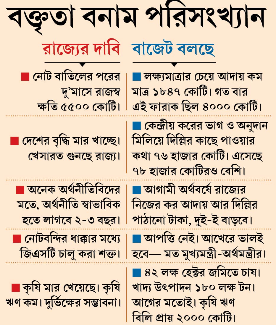 শুধু নোট বাতিলের পরের দু’মাসে ৫,৫০০ কোটি টাকা রাজস্ব হারানোর আশঙ্কা প্রকাশ করেছে রাজ্য। অথচ এ দিন অমিতবাবু যে রাজ্য বাজেট পেশ করলেন, তার পরিসংখ্যান বলছে, এই অর্থবর্ষে রাজ্যের নিজের কর আদায় পৌঁছে যাবে লক্ষ্যের কাছাকাছি। আদায় কম হবে মাত্র ১,৮৪৭ কোটি টাকা। যেখানে আগের বার এই ফারাক ছিল ৪,০০০ কোটি। নোট বাতিলের ঝঞ্ঝাট কিন্তু তখন ছিল না।