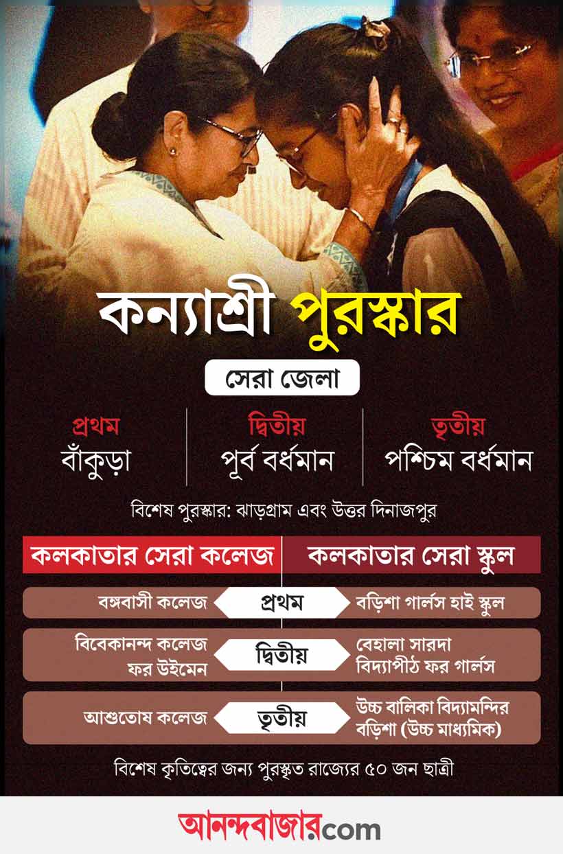 ২০১৩ সাল থেকে রাজ্য সরকার কন্যাশ্রী প্রকল্প শুরু করে। প্রথমে ছিল শুধু স্কুল স্তরের ছাত্রীদের জন্য। পরে কলেজ এবং বিশ্ববিদ্যালয়কেও এই প্রকল্পের সঙ্গে যুক্ত করা হয়। কলেজ এবং বিশ্ববিদ্যালয় স্তরে কেন কন্যাশ্রী শুরু করা হয়, সেই ভাবনার কথাও ধনধান্য প্রেক্ষাগৃহে তুলে ধরেন মুখ্যমন্ত্রী। মমতা বলেন, “আমি দেখলাম, অনেক বাবা-মা চিন্তা করেন। তাড়াতাড়ি বিয়ে দিয়ে দেওয়ার ‘প্রেশার’ দেন বাচ্চাদের উপরে। তারা পড়াশোনা করতে পারে না। সেই জন্য তাদের কলেজ এবং বিশ্ববিদ্যালয়টাও কভার করা উচিত। আজ কিন্তু সরকারি স্কুলে সবাই কন্যাশ্রী।’’ মমতা আরও বলেন, ‘‘কোনও ভেদাভেদ নেই, ভাগাভাগি নেই। কলেজে তাঁরা কন্যাশ্রী-২ পান, বিশ্ববিদ্যালয়ে কন্যাশ্রী-৩ পান। তার পরেও যাঁরা বাইরে পড়াশোনা করতে চান, ইঞ্জিনিয়ার, ডাক্তার থেকে নানা রকম কিছু হতে চান, তাঁদের জন্য ১০ লক্ষ টাকার স্মার্ট কার্ড আছে।”