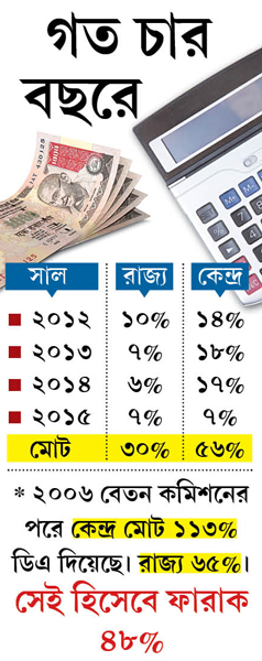 রাজ্যের অর্থ-কর্তাদের ব্যাখ্যা: প্রথামাফিক কেন্দ্র ও রাজ্যগুলি সাধারণত বছরে দু’কিস্তি ডিএ দেয়। বাম জমানার পশ্চিমবঙ্গেও রেওয়াজটা মোটামুটি বহাল ছিল। কিন্তু পালাবদলের পরে নতুন সরকার ক্ষমতায় আসা ইস্তক বছরে এক কিস্তির বেশি ডিএ মিলছে না। তাই ব্যবধান বাড়ছে চড়চড়িয়ে। বাম আমলের শেষ বছরে যেখানে ফারাক ছিল ১৬%, এখন সেটাই এখন তিন গুণ বেড়ে ৪৮%।