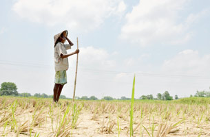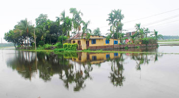 দুই চিত্র। (বাঁ দিকে) বালুরঘাটে বৃষ্টির আশায় চাষি। (ডান দিকে) জলপাইগুড়িতে জলমগ্ন গোমস্তাপাড়া। অমিত মোহান্ত ও সন্দীপ পালের তোলা ছবি।