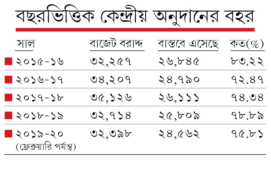 এখন অধিকাংশ ক্ষেত্রেই কেন্দ্রীয় অনুদানের উপর রাজ্যের খবরদারি নেই। বরং সময়ে ‘ম্যাচিং গ্রান্ট’ দিতে না-পারলে অর্থ দফতরকে সুদ দিতে হয়। নইলে পরের বছরের টাকা থেকে কেটে নেয় দিল্লি।