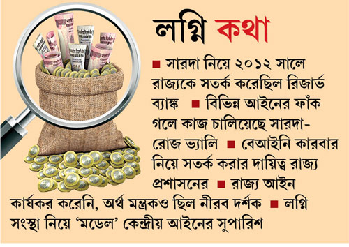 সারদা গোষ্ঠী যে বেআইনি ভাবে টাকা তুলছে, সে বিষয়ে রিজার্ভ ব্যাঙ্ক মমতা বন্দ্যোপাধ্যায়ের সরকারকে সতর্ক করেছিল। সেটা ২০১২ সাল। কিন্তু তার পরে এ বিষয়ে আর কোনও সাড়া শব্দই হয়নি। অর্থ মন্ত্রকের সংসদীয় স্থায়ী কমিটিকে এমনটাই জানিয়েছে রিজার্ভ ব্যাঙ্ক।