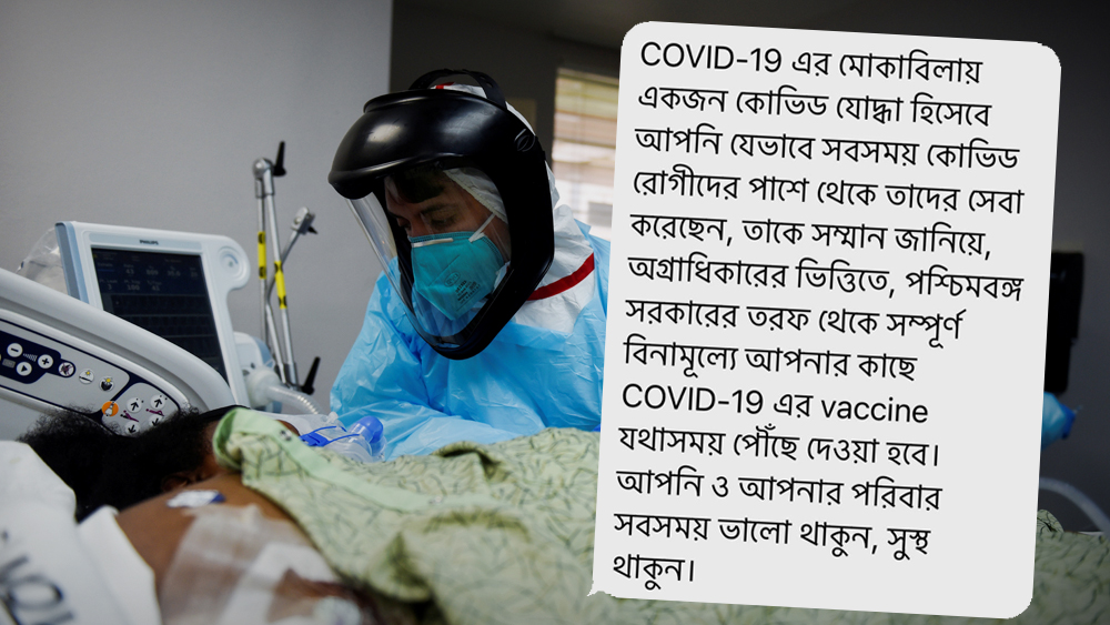 ইতিমধ্যে চিকিৎসকদের মোবাইলে এসএমএস পাঠিয়ে সে বিষয়টি নিশ্চিত করা হচ্ছে রাজ্য সরকারের তরফে। যেমন এক চিকিৎসকের ফোনে পাঠানো বার্তায় বলা হয়েছে, ‘কোভিড-১৯ এর মোকাবিলায় একজন কোভিডযোদ্ধা হিসাবে আপনি যেভাবে রোগীদের পাশে থেকে তাঁদের সেবা করেছেন, তাকে সম্মান জানিয়ে অগ্রাধিকারের ভিত্তিতে পশ্চিমবঙ্গ সরকারের তরফে সম্পূর্ণ বিনামূল্যে কোভিড ১৯ ভ্যাকসিন যথাসময়ে পৌঁছে দেওয়া হবে’। সরকারের এই সিদ্ধান্তে প্রত্যাশিত ভাবেই খুশি চিকিৎসকেরা। তবে পাশাপাশিই তাঁদের দাবি, শুধু স্বাস্থ্যকর্মীই নয়, সকলকেই করোনার টিকা দেওয়ার ব্যাপারে দ্রুত পদক্ষেপ করতে হবে। তা হলেই সমাজ সামগ্রিক ভাবে করোনা-মুক্ত হবে।