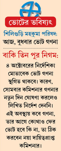 কমিশন সূত্রের খবর, কথা ছিল মঙ্গলবার দফতরে এসে সুশান্তবাবু আনুষ্ঠানিক ভাবে কোন কোন ওয়ার্ডের কোন বুথে পুনর্নির্বাচন হবে, তা ঘোষণা করবেন। কিন্তু এ দিন অফিসেই আসেননি তিনি। লাউডন স্ট্রিটে এ দিনও সকাল থেকেই নির্বাচন কমিশনের অফিসের সামনে ধর্নায় বসেছিল তৃণমূল। আর কমিশন অফিসে কর্মীরা ঘুরছিলেন অসহায় ভাবে! কারণ আজ, বুধবার শিলিগুড়ি মহকুমা পরিষদ ও ত্রিস্তর পঞ্চায়েতের ভোট গণনা। একই সঙ্গে, কথা মতো ৮ অক্টোবর পুনর্নির্বাচন করার জন্য বা ৯ তারিখে ভোটগণনার দিন চূড়ান্ত করতে হলে এ দিনই তার নির্দেশ জারি করতে হবে। কিন্তু নানা ভাবে চেষ্টা করেও কমিশনের অন্য শীর্ষ কর্তারা কেউই উপাধ্যায়কে ধরতে পারেননি। ফলে বিভ্রান্তি ছড়ায় তাঁদের মধ্যে।