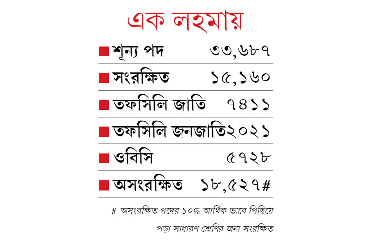 মুখ্যমন্ত্রী বিধানসভায় জানান, রাজ্যের বিভিন্ন দফতরে বহু কর্মী অবসর নেওয়ায় পদ খালি হয়েছে। এখন ৩৩ হাজার ৬৮৭ পদ ফাঁকা। তার মধ্যে ১৮ হাজার ৫২৭টি পদ অসংরক্ষিত। অসংরক্ষিত পদের ১০% আর্থিক ভাবে পিছিয়ে থাকা সাধারণ শ্রেণির জন্য রাখা থাকবে। অসংরক্ষিত পদের পাশাপাশি সংরক্ষিত থাকবে ১৫ হাজার ১৬০টি পদ। তার মধ্যে তফসিলি জাতির জন্য ৭৪১১, তফসিলি জনজাতির জন্য ২০২১ এবং ওবিসি বা অন্যান্য অনগ্রসর শ্রেণির জন্য ৫৭২৮টি পদ সংরক্ষিত থাকবে। মুখ্যমন্ত্রী জানান, ‘গ্রুপ এ’ ‘গ্রুপ বি’, ‘গ্রুপ সি’ এবং ‘গ্রুপ ডি’ মিলিয়েই প্রায় ৩৪ হাজার পদ ফাঁকা। ওই সব পদে অফিসার থেকে চতুর্থ শ্রেণির কর্মীদের একসঙ্গেই যাতে নিয়োগ করা যায়, সরকার সেই চেষ্টা চালাচ্ছে।
