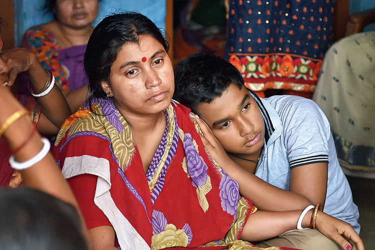 স্বজনহারা: সন্দেশখালিরই ভাঙ্গিপাড়ায় নিহত বিজেপি-কর্মী প্রদীপ মণ্ডলের স্ত্রী ও ছেলে। ছবি: বিশ্বনাথ বণিক