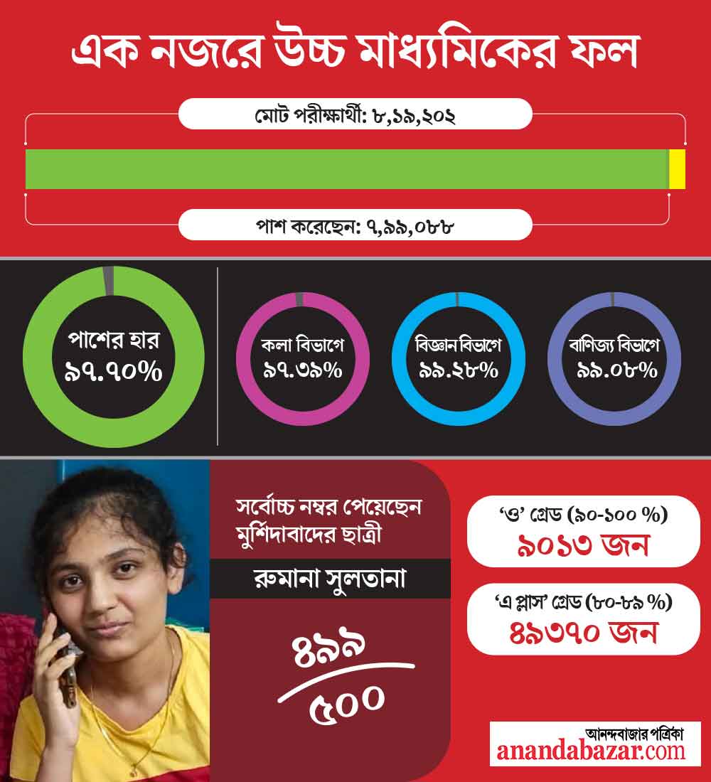 উচ্চ মাধ্যমিক পরীক্ষার ফল প্রকাশের আগে একটি প্রশ্নই ঘুরে ফিরে উঠছিল, তা হল মাধ্যমিকের মতো উচ্চ মাধ্যমিকেও কি পাশের হার ১০০ শতাংশ হবে? মাধ্যমিকের পাশের হার নিয়ে অনেকেই প্রশ্ন তুলেছিলেন। উচ্চ মাধ্যমিকে পাশের হার ১০০ শতাংশ না হলেও রেকর্ড পর্যায়ে পৌঁছেছে। ৯৭.৭০ শতাংশ ছাত্রছাত্রী উত্তীর্ণ হয়েছেন এ বার। এর মধ্যে কলা বিভাগে ৯৮.৪৭ শতাংশ, বিজ্ঞান বিভাগে ৯৯.২৮ শতাংশ এবং বাণিজ্য বিভাগে ৯৯.০৮ শতাংশ পরীক্ষার্থী উত্তীর্ণ হয়েছেন।