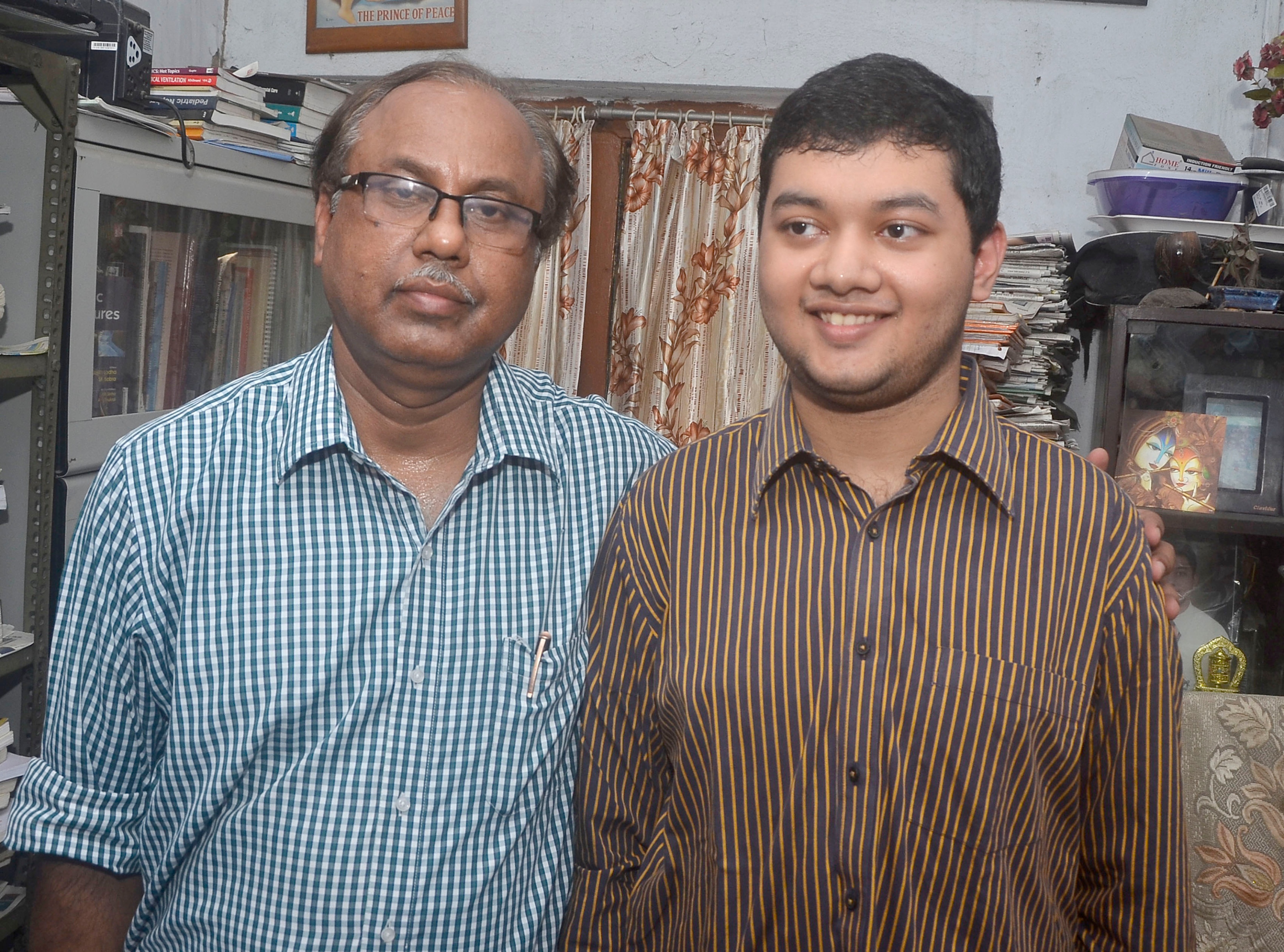 বাবার সঙ্গে তৃতীয় স্থানাধিকারী সপ্তর্ষি ঘোষ। নিজস্ব চিত্র।
