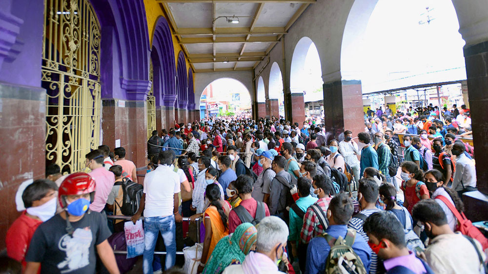 বিধি উড়িয়েই: হাওড়া স্টেশনের বাইরে যাত্রীদের ভিড়। ছবি: দীপঙ্কর মজুমদার।