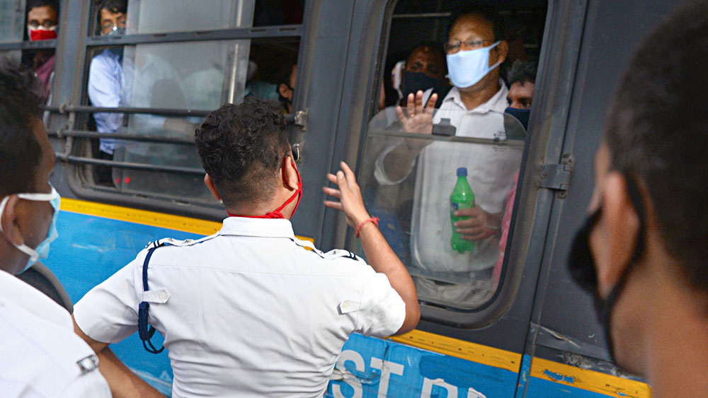 ধর্মতলায় বাস থেকে যাত্রীদের একাংশকে নেমে আসতে বলছেন এক ট্র্যাফিক পুলিশ। মঙ্গলবার। ছবি: স্বাতী চক্রবর্তী।