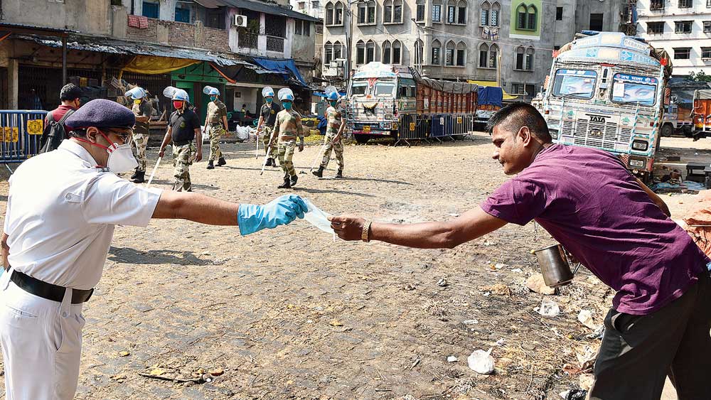 পারস্পরিক দূরত্ব-বিধি মেনেই মাস্ক বিতরণ পুলিশের। রবিবার বড়বাজার এলাকায়। ছবি: বিশ্বনাথ বণিক