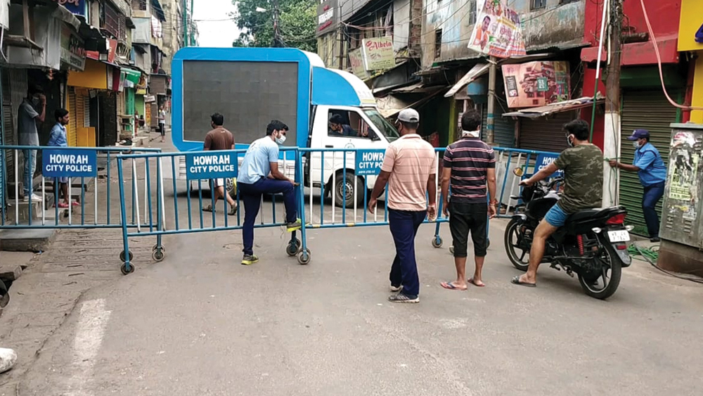 রাজ্যে করোনা-হটস্পটগুলি চিহ্নিত করার কাজ আগেই শুরু করে দিয়েছিল প্রশাসন। এ বার সেই মতো শুরু হয়ে গেল তত্পরতা। দক্ষিণবঙ্গে বিশেষ ভাবে চিহ্নিত হাওড়া জেলার বিভিন্ন এলাকায়, শনিবার সকাল থেকেই ‘সম্পূর্ণ লকডাউন’-এর প্রস্তুতি চলছে। গাড়ি, সাইকেল, লোকজন চলাচল থেকে শুরু করে দোকান-বাজার নিয়ন্ত্রণের জন্য পুলিশ-প্রশাসন নেমে পড়েছে রাস্তায়। বহু জায়গাতেই ব্যারিকেড করে দেওয়া হয়েছে।