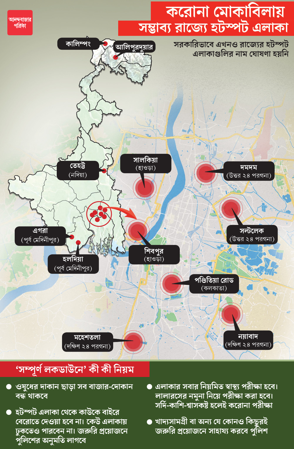 প্রশাসনের তরফে ওই হটস্পটগুলির নাম প্রকাশ্যে আনা হয়নি। যদিও নবান্নের একটি সূত্র জানাচ্ছে, উত্তর ২৪ পরগনার দমদম-সল্টলেক, পূর্ব মেদিনীপুরের এগরা-হলদিয়া, দক্ষিণ ২৪ পরগনার মহেশতলা-নয়াবাদ, নদিয়ার তেহট্ট, কালিম্পং, আলিপুরদুয়ার, দক্ষিণ কলকাতার পণ্ডিতিয়া রোড এলাকা, হাওড়ার সালকিয়া-শিবপুর— সম্ভাব্য হটস্পট হিসাবে চিহ্নিত করা হচ্ছে। এই সব এলাকার কিছু কিছু জায়গায় পরিস্থিতি অনুযায়ী পদক্ষেপ করবে প্রশাসন। হটস্পটগুলির আশপাশের এলাকাকে ‘ক্লাস্টার’ বলা হচ্ছে। সেখানেও সম্পূর্ণ লকডাউন না থাকলেও, কড়াকড়ি থাকবে বেশ কিছু ক্ষেত্রে।