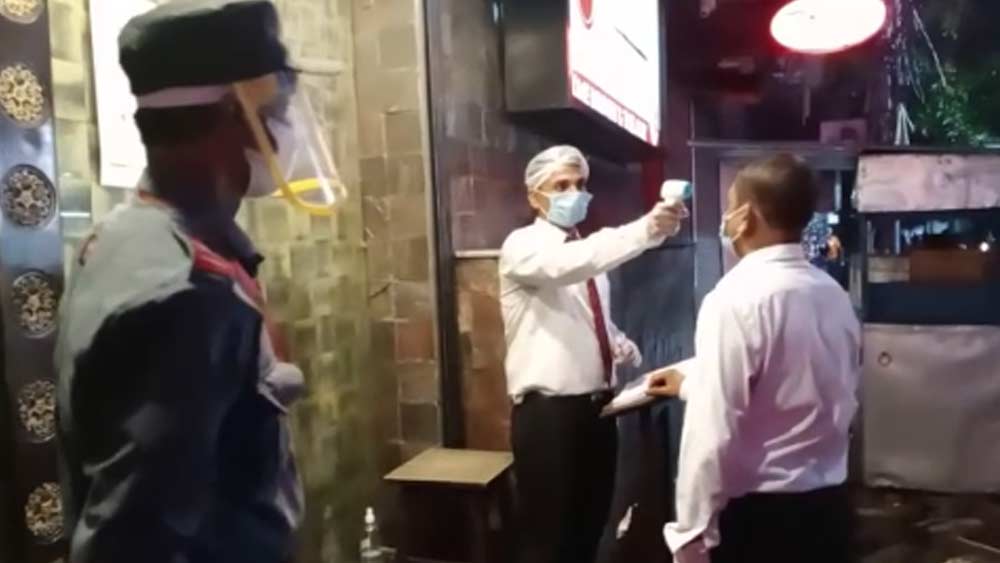 রেস্তরাঁয় ঢোকার মুখে চলছে থার্মাল স্ক্রিনিং। লিটল রাসেল স্ট্রিট চত্বরে তোলা নিজস্ব চিত্র।