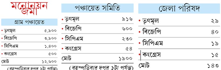 বুধবার রাজ্যপালের কাছে গিয়ে সন্ত্রাসের ভূরি ভূরি অভিযোগ পাওয়ার কথা বলেছিলেন রাজ্য নির্বাচন কমিশনার অমরেন্দ্রকুমার সিংহ। কিন্তু তার ২৪ ঘণ্টার মধ্যেই পরিসংখ্যান পেশ করে কমিশন দাবি করল, মনোনয়নপত্র জমা দেওয়ার পর্ব নির্বিঘ্নেই চলছে। শাসক দলের পাশাপাশি বিরোধীরাও সমান তালে মনোনয়ন জমা দিচ্ছে। কমিশনের এ-ও দাবি, এ বারের পরিস্থিতি ২০১৩ সালের থেকে ভাল।
