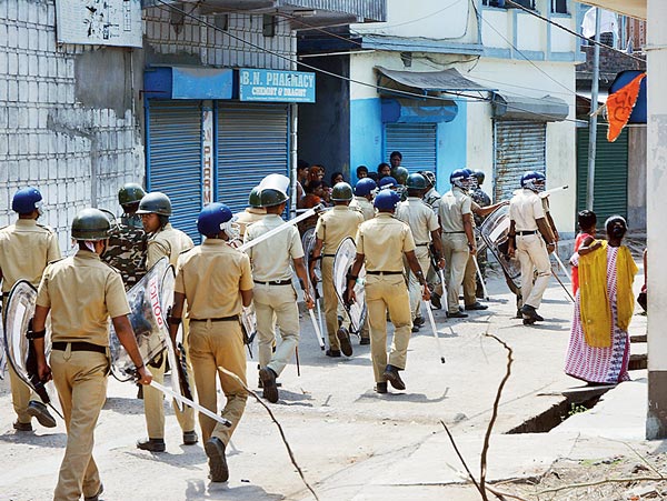প্রহরা: আসানসোলের চাঁদমারি এলাকায় পুলিশের টহল। —নিজস্ব চিত্র।