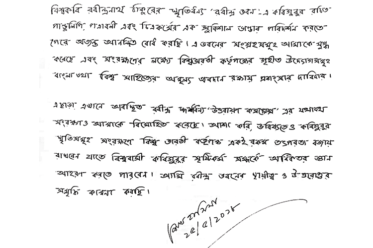 বিশ্বভারতীর ভিজিটর্স বুকে শেখ হাসিনার লেখার অংশ।