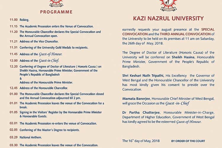 শনিবার আসানসোলে কাজী নজরুল বিশ্ববিদ্যালয়ের সমাবর্তন অনুষ্ঠানে হাসিনাকে সাম্মানিক ডি লিট দেওয়া হবে। মুখ্যমন্ত্রী সেখানে গেলে বাংলাদেশের প্রধানমন্ত্রীর সঙ্গে আলোচনার একটা সম্ভাবনা ছিল। কিন্তু মমতা আসানসোল যাচ্ছেন না। এই খবর পাওয়ার পরে তড়িঘড়ি নতুন আমন্ত্রণপত্র ছেপেছেন বিশ্ববিদ্যালয় কর্তৃপক্ষ। আগের আমন্ত্রণপত্রে শেখ হাসিনা, রাজ্যপাল ত্রিপাঠীর পাশাপাশি মুখ্যমন্ত্রীর নাম ছিল। বুধবার শিক্ষামন্ত্রী পার্থ চট্টোপাধ্যায়কে এ বিষয়ে প্রশ্ন করা হলে তিনি বলেন, ‘‘যত দূর জানি, ওখানে যাওয়ার কোনও কর্মসূচি মুখ্যমন্ত্রীর ছিল না।’’