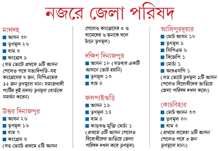 ছ’টির মধ্যে উত্তর দিনাজপুর এবং কোচবিহার ছাড়া বাকি চারটিই জিতেছিল বিরোধীরা। পরে ধীরে ধীরে সেই চারটি জেলা পরিষদ কব্জা করে তৃণমূল। শনিবার পঞ্চায়েত ভোট ঘোষণার পরে শাসকদলের কাছে এখন তাই বড় পরীক্ষা সব ক’টি জেলায় নিজেদের প্রতিপত্তি প্রতিষ্ঠা করা। পরিবর্তিত রাজনৈতিক সমীকরণে এই কাজে তৃণমূলের প্রধান বাধা বিজেপি। একান্ত আলোচনায় সে কথা মানছেন অনেক নেতাই। একই সঙ্গে কয়েকটি জায়গায় বাম-কংগ্রেস আগের মতো শক্তি ধরে রাখতে পারবে কিনা, তা-ও দেখার।