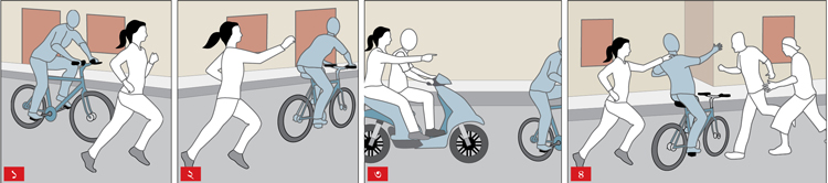 ৩) অভিযুক্ত তীব্র বেগে সাইকেল চালিয়ে একটি গলিতে ঢুকে পড়েন। তত ক্ষণে আশপাশের মানুষজনও বুঝতে পেরেছেন কী ঘটেছে। এক স্কুটার-চালক ওই তরুণীকে পিছনে বসিয়ে অভিযুক্তকে তাড়া করেন। ৪) শেষমেশ ধরা পড়ে যান অভিযুক্ত। তরুণীকে সাহায্য করতে এগিয়ে এসেছিলেন স্থানীয়েরাও। গ্রাফিক্স: প্রবাল ধর
