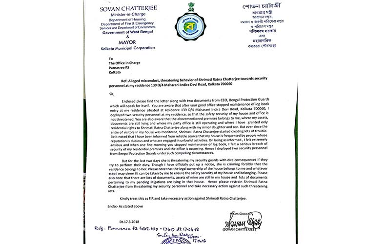 পুলিশকে লেখা অভিযোগপত্রে শোভন দাবি করেছেন যে, বেশ কিছু বাইরের লোকজন তাঁর স্ত্রী মদতে ওই বাড়িতে যাওয়া-আসা শুরু করেছে বলে তাঁর কাছে খবর রয়েছে। সেই জন্য তিনি তাঁর সম্পত্তি, নথিপত্র-সহ নিজের নিরাপত্তা নিয়ে শঙ্কিত। গোটা ঘটনা জানিয়ে ওই বেসরকারি নিরাপত্তা সংস্থার সিইও একটি চিঠিও দিয়েছেন মেয়রকে। বাইরের লোকজনের যাতায়াতের বিষয়টি জানিয়ে সংস্থার সিইও-কে আগেই চিঠিতে জানিয়েছিলেন মনোজিৎ ভৌমিক এবং রবিন রায় নামে ওই সংস্থার দুই নিরাপত্তারক্ষী। এর পর গোটা বিষয়টিই মেয়রকে জানান সিইও। নিজের অভিযোগপত্রের সঙ্গে ওই দু’টি চিঠির প্রতিলিপিও থানায় জমা দিয়েছেন মেয়র।