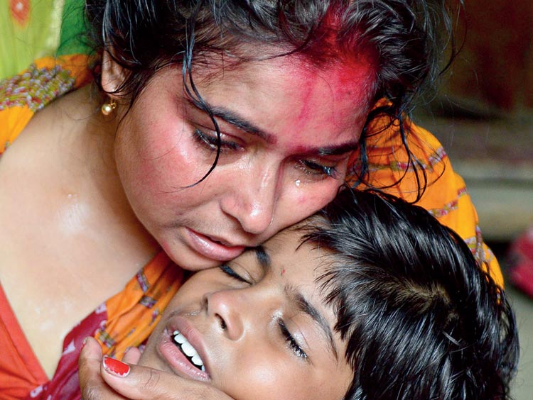 শোকাহত: স্বামী সমর টিকাদারের কফিন দেখে মেয়েকে জড়িয়ে কান্না দীপালির। ভীমপুরের মহখোলায়। ছবি: সুদীপ ভট্টাচার্য