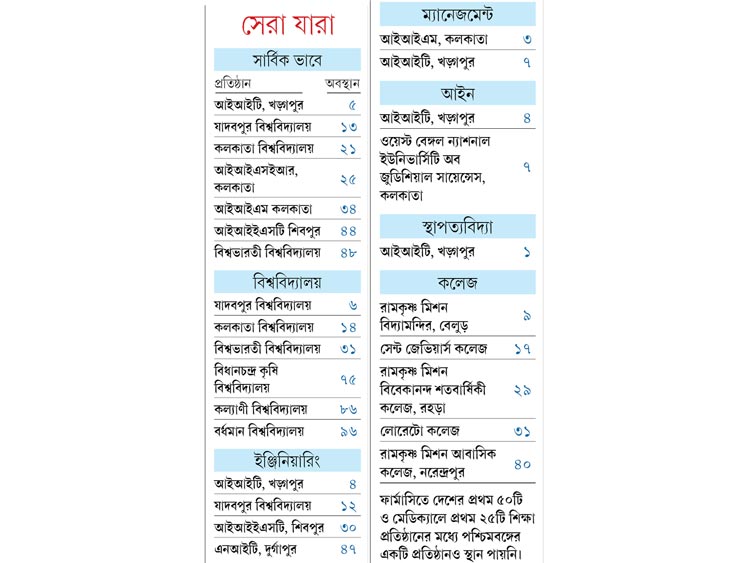 খড়্গপুর আইআইটি গত বার উচ্চশিক্ষা প্রতিষ্ঠানের সার্বিক তালিকা এবং ইঞ্জিনিয়ারিং শিক্ষা প্রতিষ্ঠানের তালিকায় ছিল যথাক্রমে চতুর্থ এবং তৃতীয় স্থানে। দুই ক্ষেত্রেই এ বার তারা এক ধাপ নেমেছে। বিশ্বভারতী নেমেছে বেশ কয়েক ধাপ। উচ্চশিক্ষা প্রতিষ্ঠান এবং বিশ্ববিদ্যালয়— এই দুই বিভাগে গত বছর বিশ্বভারতী ছিল ৩১ এবং ১৯তম স্থানে। এ বার যথাক্রমে ৪৮ এবং ৩১তম স্থানে নেমে গিয়েছে তারা। শিবপুর আইআইইএসটি গত বছর উচ্চশিক্ষা প্রতিষ্ঠান বিভাগে ৭৩তম স্থান পেয়েছিল। এ বার উঠে এসেছে ৪৪তম স্থানে। ইঞ্জিনিয়ারিং বিভাগে গত বছর ১৭-য় থাকা সত্ত্বেও এ বার পিছিয়ে গিয়েছে ৩০তম স্থানে।