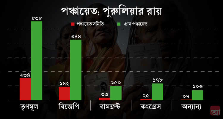 গ্রাম পঞ্চায়েত স্তরে মোট ১৯২১টি আসনে ভোট হয়েছে পুরুলিয়ায়। তৃণমূল জিততে পেরেছে ৮৩৮টি আসনে। প্রায় চিহ্ন ছিল না যাদের, সেই বিজেপি প্রায় সেয়ানে সেয়ানে টক্করে। ৬৪৪টি আসন পেয়েছে বিজেপি। এত দিন জেলায় মূল বিরোধী দল ছিল যে কংগ্রেস, তারা পেয়েছে ১৭৮টি আসন। বামেরা ১৫০টি।