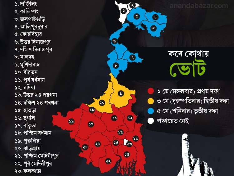 ঘোষণা হয়ে গেল ত্রিস্তর পঞ্চায়েত নির্বাচনের দিনক্ষণ। ভোট হবে তিন দফায়— ১, ৩ এবং ৫ মে। ফলপ্রকাশ হবে ৮ মে। রাজ্য নির্বাচন কমিশনার অমরেন্দ্র কুমার সিংহ শনিবার এ কথা জানিয়েছেন।
