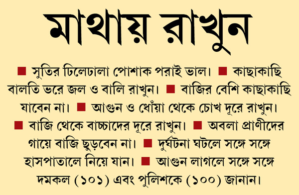 ১) ৯০ ডেসিবেলের বেশি শব্দবাজি নিষিদ্ধ। অর্থাৎ, চকোলেট বোমা-দোদমা ফাটানো যাবে না।
