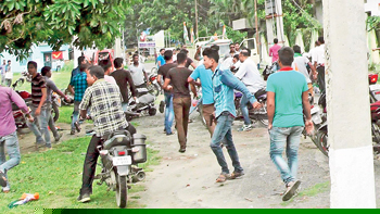 রায়গঞ্জে কংগ্রেস সমর্থকদের উপর আইএনটিটিইউসি সমর্থকদের হামলা চলার সময় যুবকের হাতে আগ্নেয়াস্ত্র। ছবি: গৌর আচার্য।