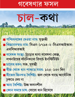 চুঁচুড়ার ধান গবেষণা কেন্দ্রে যে কৃষিবিজ্ঞানী এই নতুন প্রজাতির ধানের জনক সেই বিজন অধিকারীর দাবি, এই ধান এক দিকে যেমন আর্সেনিক প্রতিরোধ করবে, অন্য দিকে কৃষকের গোলাতেও বেশি ফসল উঠবে। বিজনবাবু জানাচ্ছেন, ২০০৫ সাল থেকে ২০০-র বেশি প্রজাতির ধানের বীজ নিয়ে পরীক্ষা-নিরীক্ষার মধ্য দিয়ে ছ’বছরে ‘মুক্তশ্রী’-র জন্ম। ২০১৩ সালে ধানটির নামকরণ করেন মুখ্যমন্ত্রী মমতা বন্দ্যোপাধ্যায়। কেন্দ্রীয় কৃষি মন্ত্রক সূত্রের খবর, ‘মুক্তশ্রী’ বিশ্বের একমাত্র উচ্চ ফলনশীল আর্সেনিক প্রতিরোধকারী ধান। লখনউ বোটানিক্যাল রিসার্চ ইন্সস্টিটিউটের সহযোগিতায় এই গবেষণার কাজ করেছে চুঁচুড়ার প্রতিষ্ঠানটি। ২০১৫ সালের ফেব্রুয়ারিতে ‘নেচার’ পত্রিকায় বিজনবাবু ও তাঁর সহযোগীদের গবেষণাপত্রটি প্রকাশিত হয়েছে।
