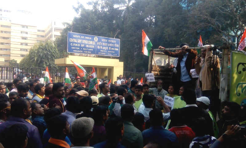 সুদীপ বন্দ্যোপাধ্যায়ের গ্রেফতারের প্রতিবাদে সিজিও কমপ্লেক্সের সামনে তৃণমূলের বিক্ষোভ। নিজস্ব চিত্র।