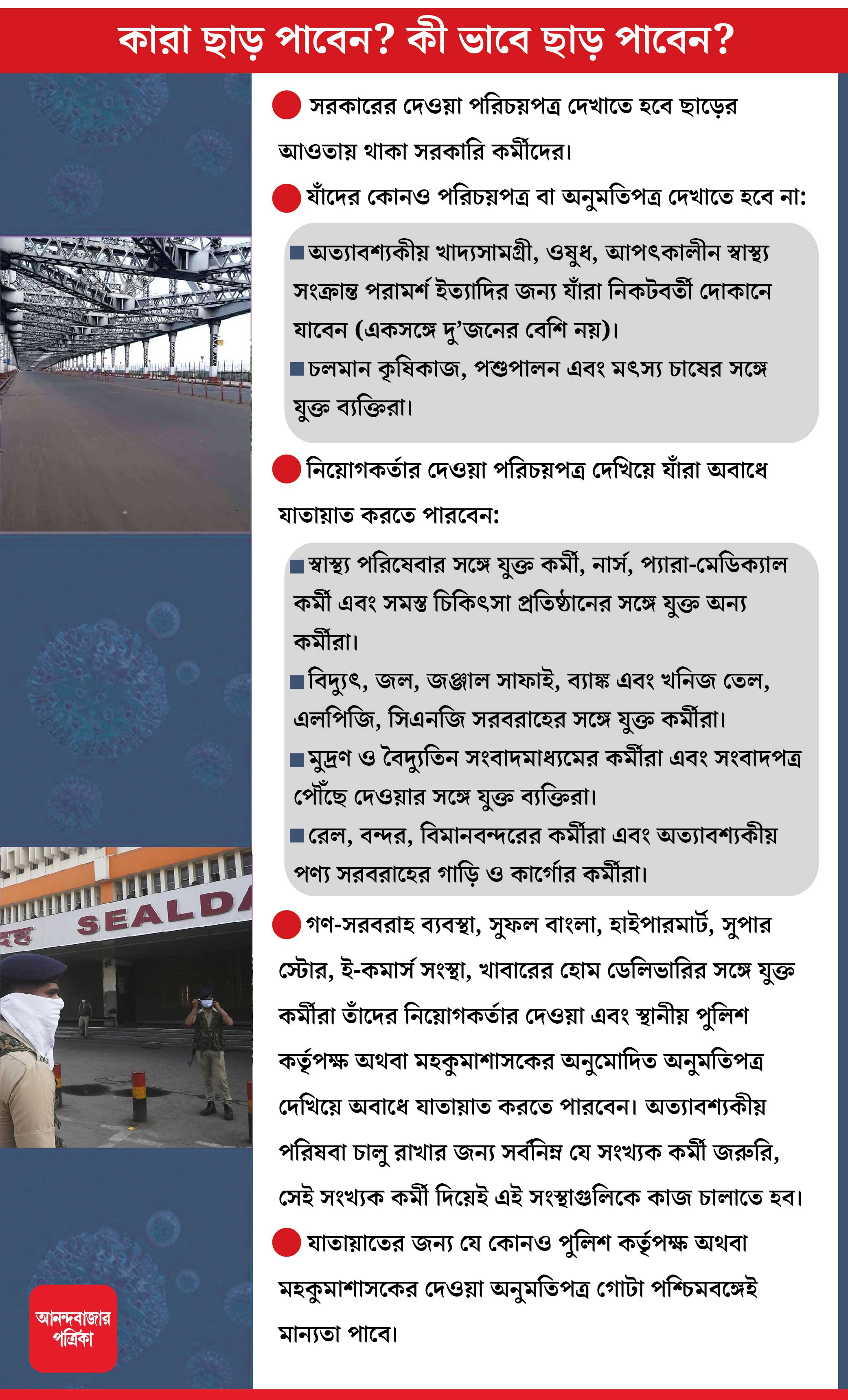 যে সব জরুরি এবং অত্যাবশ্যক বিষয় ও পরিষেবাকে লকডাউনের আওতা থেকে ছাড় দেওয়া হয়েছে, সেই সব বিষয় ও পরিষেবার সঙ্গে যুক্ত কর্মীদের যাতায়াতের বিষয়েও এ দিন নির্দেশিকা জারি করেছে রাজ্য। দেখে নিন সেই নির্দেশিকা: