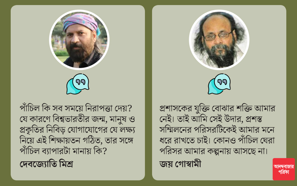 সংলাপের যে প্রয়োজন ছিলই, সে কথা স্পষ্ট হয়ে উঠল কবি জয় গোস্বামীর সঙ্গে কথা বলতে গিয়ে। তাঁর কথায়: “যত বার পৌষমেলার প্রাঙ্গনে গিয়েছি, তত বার উদার, প্রশস্ত এক আঙিনায় এসে দাঁড়ানোর অনুভব হয়েছে। মেলা চলাকালীন যখন গিয়েছি, তখন সকলের সঙ্গে সম্মিলনের অনুভব জন্মেছে। যখন পৌষ মেলা চলছে না, মাঠ ফাঁকা পড়ে আছে, তখন সেই মাঠের মধ্যে দিয়ে হেঁটেছি, বন্ধুর সাইকেলের সামনে বসে ঘুরেছি। প্রতি বারই মনে হয়েছে, এর পিছনে এক মানুষের চিন্তা কাজ করেছে— এই প্রাঙ্গন সকলের মেলামেশার পরিসর। একে কেন পাঁচিল দিয়ে ঘেরা হবে, তা বোঝার ক্ষমতা আমার নেই।’’ জয়ের অভিমত, ‘‘এই সিদ্ধান্ত যাঁরা নিচ্ছেন, তাঁরা প্রশাসক। বিশ্বভারতী একটা ইউনিভার্সিটি। সেটা চালাতে গেলে উপাচার্যকে প্রশাসক হতে হয়। প্রশাসকের যুক্তি নিশ্চয়ই কিছু রয়েছে। সেটা বোঝার শক্তি আমার নেই। তাই আমি সেই উদার, প্রশস্ত সম্মিলনের পরিসরটিকেই আমার মনে ধরে রাখতে চাই। কোনও পাঁচিল ঘেরা পরিসর আমার কল্পনায় আসছে না।”