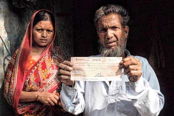 মাখড়ায় চেক হাতে তৌসিফের বাবা। ছবি: বিশ্বজিৎ রায়চৌধুরী।