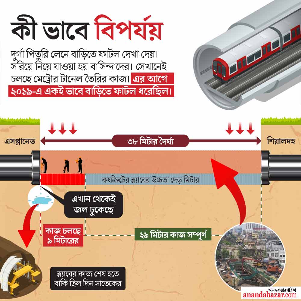 পরবর্তীতে ঠিক হয়, ওই বক্সের নীচে ৩৮ মিটার কংক্রিটের স্ল্যাব তৈরি করে জল চুঁইয়ে পড়া রোখা হবে। সেই মতো কাজও চলছিল। বক্সের ৩৮ মিটারের মধ্যে শিয়ালদহের দিক থেকে ২৯ মিটার এলাকায় কংক্রিটের স্ল্যাব তৈরিও শেষ হয়ে গিয়েছিল। বাকি ছিল এসপ্লানেডের দিকের মাত্র ৯ মিটারের কাজ। বুধবার সন্ধ্যায় বিপত্তির মূলেও সেই ৯ মিটার এলাকাই। বিশেষজ্ঞেরা বলছেন, ওই অংশ দিয়েই নতুন করে জল (ওয়াটার পকেট) চুঁইয়ে ঢুকে পড়ছে মেট্রোর জন্য তৈরি সুড়ঙ্গে। ভূমিতলে বদল এসেছে। তারই প্রভাব পড়ছে ভূপৃষ্ঠের উপর দাঁড়িয়ে থাকা বাড়ি কিংবা রাস্তায়। ফাটল ধরছে তাতে।