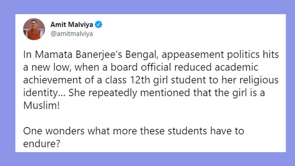 শুক্রবার সকালে এ নিয়ে টুইট করেন বিজেপি-র আইটি সেলের প্রধান তথা পশ্চিমবঙ্গের বিজেপি-র সহ-পর্যবেক্ষক অমিত মালব্য। লেখেন, ‘মমতা বন্দ্যোপাধ্যায়ের বাংলায় তোষণের রাজনীতি নতুন মাত্রা পেল যখন উচ্চ মাধ্যমিকের ফল প্রকাশের সময় সর্বোচ্চ নম্বরপ্রাপ্ত মেয়েটির নাম বলার আগে তার ধর্মপরিচয় উল্লেখ করলেন উচ্চ মাধ্যমিক শিক্ষা সংসদের সভানেত্রী। উচ্চ মাধ্যমিকের একটি মেয়ের শিক্ষাগত যোগ্যতার থেকেও বড় হয়ে দাঁড়াল তাঁর ধর্ম পরিচয়। উচ্চ মাধ্যমিক শিক্ষা সংসদের সভানেত্রী বারবার সেটি উল্লেখ করলেন। এই ছাত্রত্রীদের আর কত দিন এ সব সহ্য করতে হবে?
