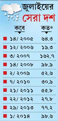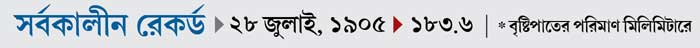 আবহাওয়া দফতরের মাপকাঠি বলছে, ভারী বৃষ্টির ক্ষেত্রে ন্যূনতম মাত্রা ৬৪.৪ মিলিমিটার। অতি ভারী বৃষ্টিপাতের সর্বাধিক মাত্রা ২৪৪.৪ মিলিমিটার। এ দিন নবান্নে যে বার্তা পৌঁছেছে তাতে বলা হয়েছে, ২৪ ঘণ্টার মধ্যে সর্বাধিক ২৪০ মিলিমিটার বৃষ্টিপাত হতে পারে। এমন পূর্বাভাস দেখেই চোখ কপালে উঠেছে অনেকের। হাওয়া অফিসের নথি বলছে, ১৯০৫ সালের ২৮ জুলাই কলকাতায় এক দিনে ১৮৩.৬ মিলিমিটার বৃষ্টি হয়েছিল। এ যাবৎকালের মধ্যে জুলাই মাসের কোনও এক দিনে সেটাই সর্বাধিক বৃষ্টিপাত। প্রশ্ন উঠেছে, এ বার কি ১১০ বছর আগের ওই রেকর্ডও ভেঙে যাবে?