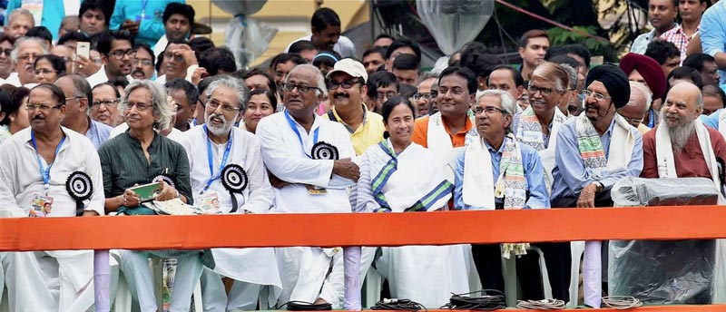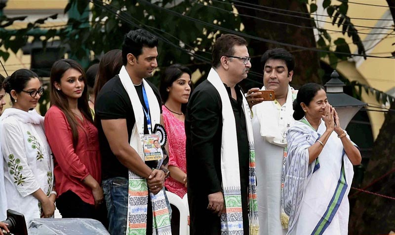 গত কয়েক বছরের মতো এ বছরও মমতা বন্দ্যোপাধ্যায়ের সমাবেশ মঞ্চ ছিল তারকাখচিত। ছবি: পিটিআই।