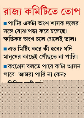 দার্জিলিঙের জীবেশ সরকার উদাহরণ দিয়ে প্রশ্ন তুলেছেন, ২০১১ সালে জেতা বাম বিধায়কদের ‘টিম’ ধরে রাখা যায়নি কেন? শমীক লাহিড়ী বলেছেন, কমিটি ভেঙে পুনর্বিন্যাস যতই হোক, পরিকল্পনায় গলদ থাকলে ফল মিলবে না। মইনুল হাসান, নেপালদেব ভট্টাচার্যদের প্রস্তাব, বিশেষ পরিস্থিতিতে বিশেষ পদক্ষেপই ভাবতে হবে দলীয় নেতৃত্বকে।