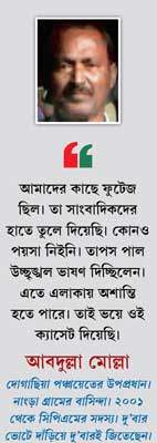 তেঘড়ির সিডিটি প্রকাশ্যে এনেছেন দোগাছিয়া পঞ্চায়েতের সিপিএমের উপপ্রধান আবদুল্লা মোল্লা। তিনি বলেন, “আমাদের কাছে ফুটেজ ছিল। তা সাংবাদিকদের হাতে তুলে দিয়েছি। টাকার বিনিময়ে কোনও ফুটেজ বিক্রি করা হয়নি। আমরা কোনও পয়সা নিইনি। তাপস পাল উচ্ছৃঙ্খল ভাষণ দিচ্ছিলেন। এতে এলাকায় অশান্তি হতে পারে। তাই ভয়ে ওই ক্যাসেট তুলে দিয়েছি। দেশের স্বার্থেই দিয়েছি। আরও কেউ চাইলে তাঁদেরও দেব। আমি চাই লোক জানুক, শাসক দলের নেতারা কী, তাঁদের মুখের ভাষা কী!”