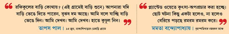 আবেগে কেঁদে ফেলেছিল বছর পনেরোর ললিতা। সেই ছবিরই নায়ক তাপস পাল গ্রামে আসছেন শুনে ছুটেছিল দেখতে। ভিড় ঠেলে কাছে যাওয়ার চেষ্টার ফাঁকেই কানে আসে তার বাবার নাম তুলে তাদেরই বাড়ি ভেঙে দেওয়ার হুমকি দিচ্ছেন নায়ক। নায়কের হুমকির পরের দিনই, ১৫ জুন নাকাশিপাড়ার তেঘড়ি গ্রামে তৃণমূল কর্মীরা হামলা চালিয়ে ললিতাদের ঘর-বাড়ি ভেঙে দেন বলে অভিযোগ।
