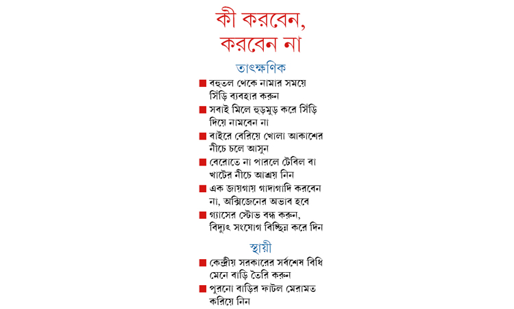 এই ঘটনার পরে স্বাভাবিক ভাবেই আলোচনা শুরু হয়েছে, শিলিগুড়ির মতো ভূকম্পপ্রবণ এলাকায় মানুষের আরও সচেতন হয়ে হাঁটাচলা করা উচিত। উত্তরবঙ্গ বিশ্ববিদ্যালয়ের ভূগোল বিভাগের শিক্ষক রঞ্জন রায় থেকে ন্যাফের মুখপাত্র অনিমেষ বসু, সকলেই জানিয়েছেন, অযথা ভয় পেয়ে তাড়াহুড়ো করা একেবারেই ঠিক নয়। ভূমিকম্প হলে লিফ্ট ব্যবহার করা ঠিক নয়। তবে সিঁড়ি দিয়ে