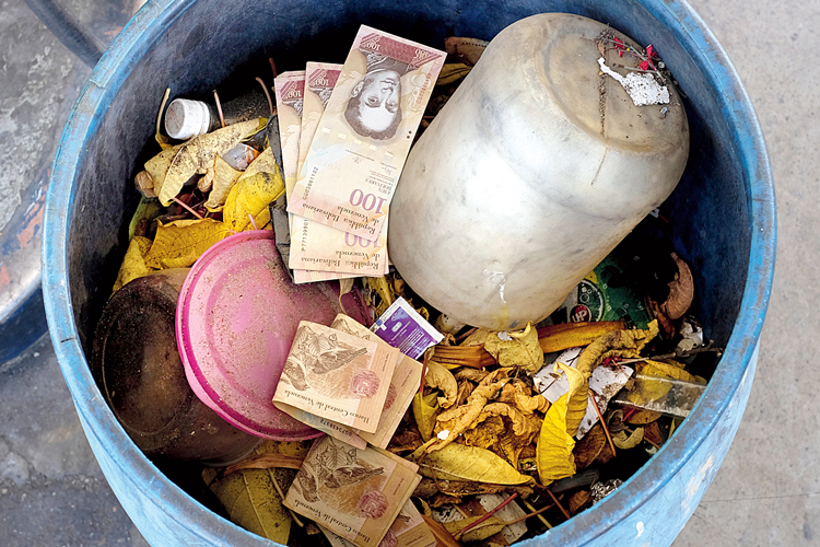 খেই হারানো অর্থনীতি আর উল্কার বেগে বাড়তে থাকা মূল্যবৃদ্ধির হারের সমস্যায় (হাইপার ইনফ্লেশন) এটি বেশ চেনা ছবি। যেমন, এখনও জীবন্ত প্রথম বিশ্বযুদ্ধের পরে ১৯২২ সাল নাগাদ বিধ্বস্ত জার্মান অর্থনীতির স্মৃতি। মূল্যবৃদ্ধি এমন পর্যায়ে পৌঁছেছিল যে, এক টুকরো পাঁউরুটি কিনতে ঠেলাগাড়ি করে নিয়ে যেতে হত জার্মান মুদ্রা মার্কের বান্ডিল। রাস্তাঘাটে কম অঙ্কের মুদ্রা জড়ো করে পুড়িয়ে আগুন পোহাতেন মানুষ। বলা চলে প্রতি ঘণ্টায় লাফিয়ে বাড়ত প্রয়োজনীয় জিনিসপত্রের দাম। ১৯২৩ সাল নাগাদ ১ ডলারের দাম পৌঁছেছিল ৪ লক্ষ ২১ হাজার কোটি মার্কে! অনেকে বলছেন, এখন ভেনেজুয়েলার দশা কিছুটা তেমনই।