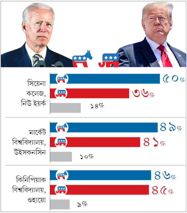 করোনা মোকাবিলায় ট্রাম্প প্রশাসনের ব্যর্থতা ও দেশ জুড়ে চলা বর্ণবিক্ষোভের আঁচ যে আগামী ভোটে পড়ছেই, তার ইঙ্গিত মিলছে এ সপ্তাহে করা দেশের বেশ কয়েকটি জনমত সমীক্ষায়। নিউ ইয়র্কের সিয়েনা কলেজের করা একটি সমীক্ষা বলছে, এই মুহূর্তে ট্রাম্পের থেকে বেশ কিছুটা এগিয়ে রয়েছেন ডেমোক্র্যাট প্রেসিডেন্ট পদপ্রার্থী জো বাইডেন। ১৭-২২ জুনের মধ্যে ১৩৩৭ জন ভোটারকে নিয়ে করা ওই সমীক্ষায় ট্রাম্পকে ফের হোয়াইট হাউসে দেখতে চেয়ে ভোট দিয়েছেন ৩৬ শতাংশ। আর ডেমোক্র্যাট দলের প্রার্থীকে দেখতে চেয়েছেন ৫০ শতাংশ। অ-শ্বেতাঙ্গেরা ভরসা রাখছেন বাইডেনের উপরেই। উইসকনসিনের মার্কেট বিশ্ববিদ্যালয়ের করা সমীক্ষাতেও ট্রাম্পের থেকে ৮ শতাংশ বেশি সমর্থন পেয়েছেন বাইডেন। রিপাবলিকানদের শক্ত ঘাঁটি বলে পরিচিত ওহায়োর কিনিপিয়াক বিশ্ববিদ্যালয়ের সমীক্ষায় হাড্ডাহাড্ডি লড়াইয়েও পিছিয়ে পড়েছেন ট্রাম্প।