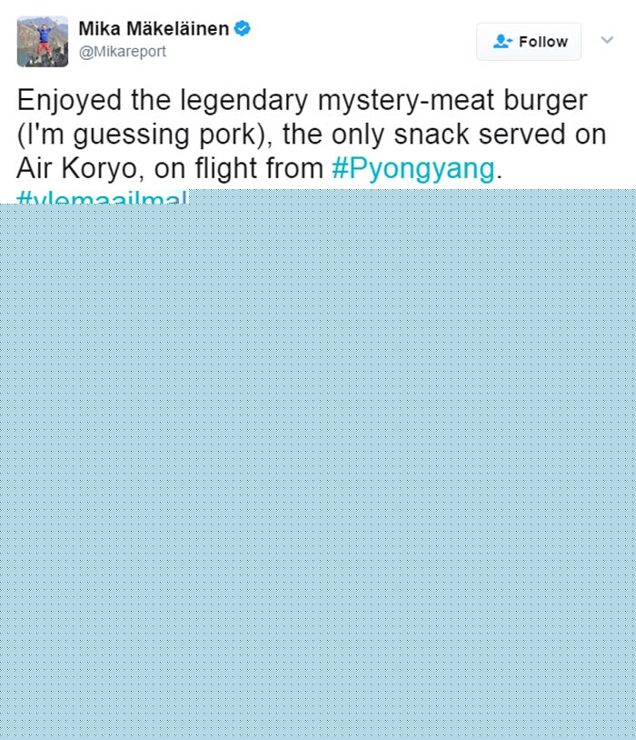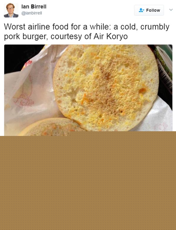 এই বিমানে পিয়ংইয়ং থেকে বেজিংগামী এক যাত্রী তাঁর ভাগের খাবারের ছবিও টুইট করে লেখেন, “রহস্যময় মাংসের বিখ্যাত সেই মিট বার্গার (আমার ধারণা এটা শুয়োরের মাংস)! এয়ার কোরিয়ায় পরিবেশিত একমাত্র খাবার।”