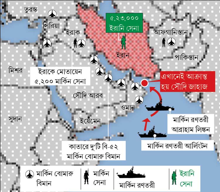বিমানবাহী রণতরী, বোমারু বিমান ইতিমধ্যেই পৌঁছে গিয়েছে। ইরানকে চাপে রাখতে নাকি পশ্চিম এশিয়ায় এক লক্ষ কুড়ি হাজার সেনা পাঠানোর পরিকল্পনা করছে আমেরিকা। যা আরও এক বার উস্কে দিয়েছে ইরাক যুদ্ধের স্মৃতি।