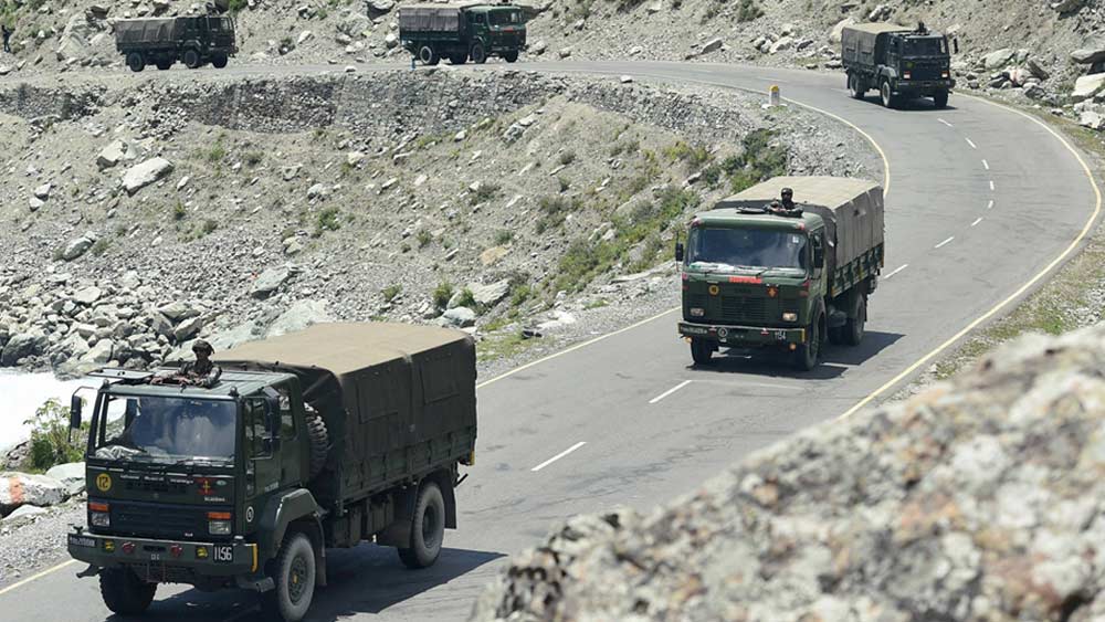 লাদাখের রাস্তায় সেনা ট্রাকের বহর। ছবি: পিটিআই।